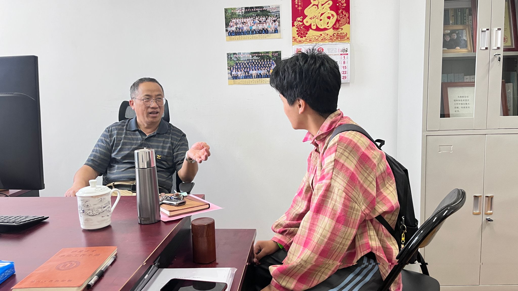 6月6日上午,啪啪啦 关工委副主任陈树人教授在院606办公室与少数民族学生开展谈心谈话。