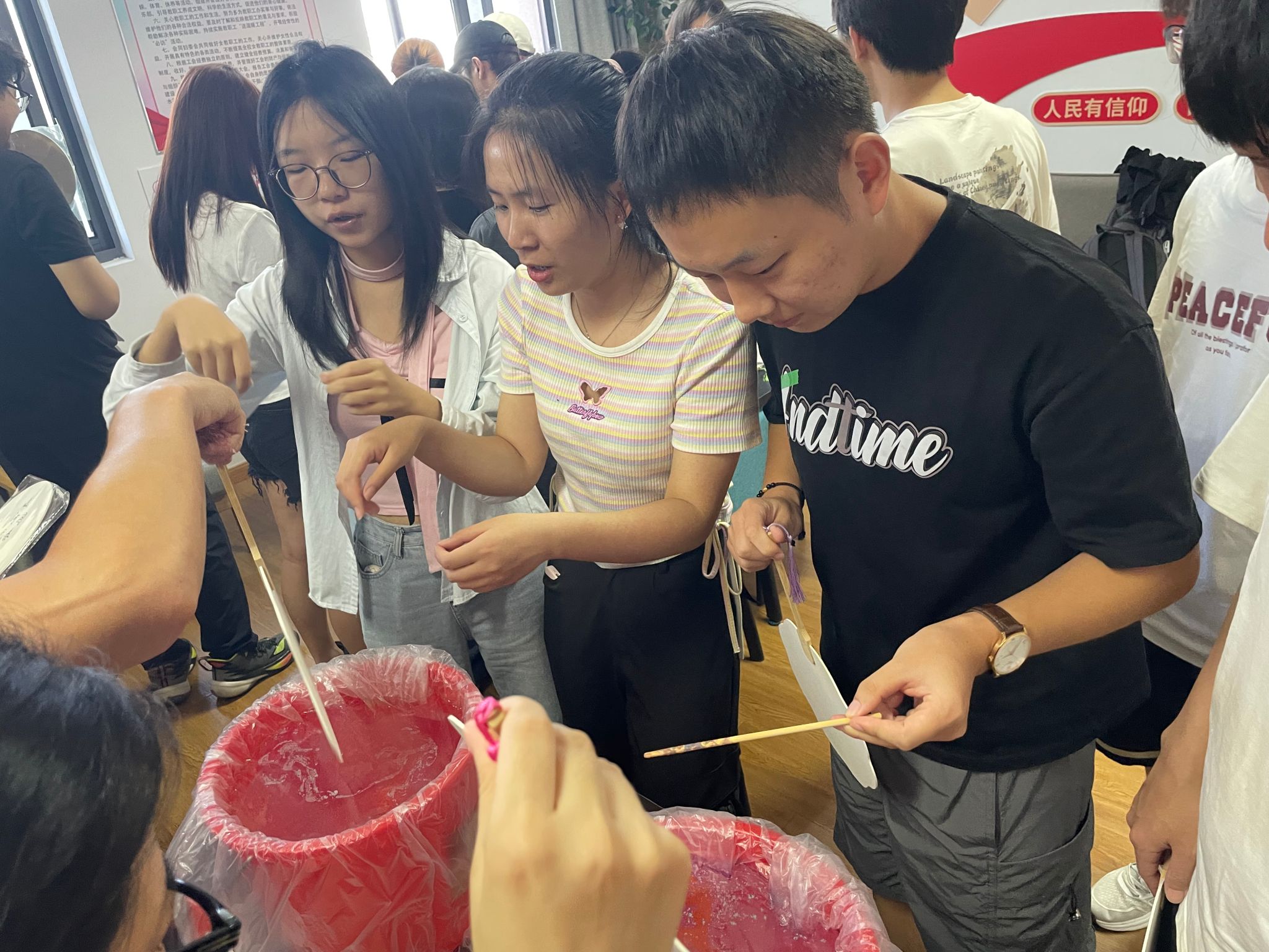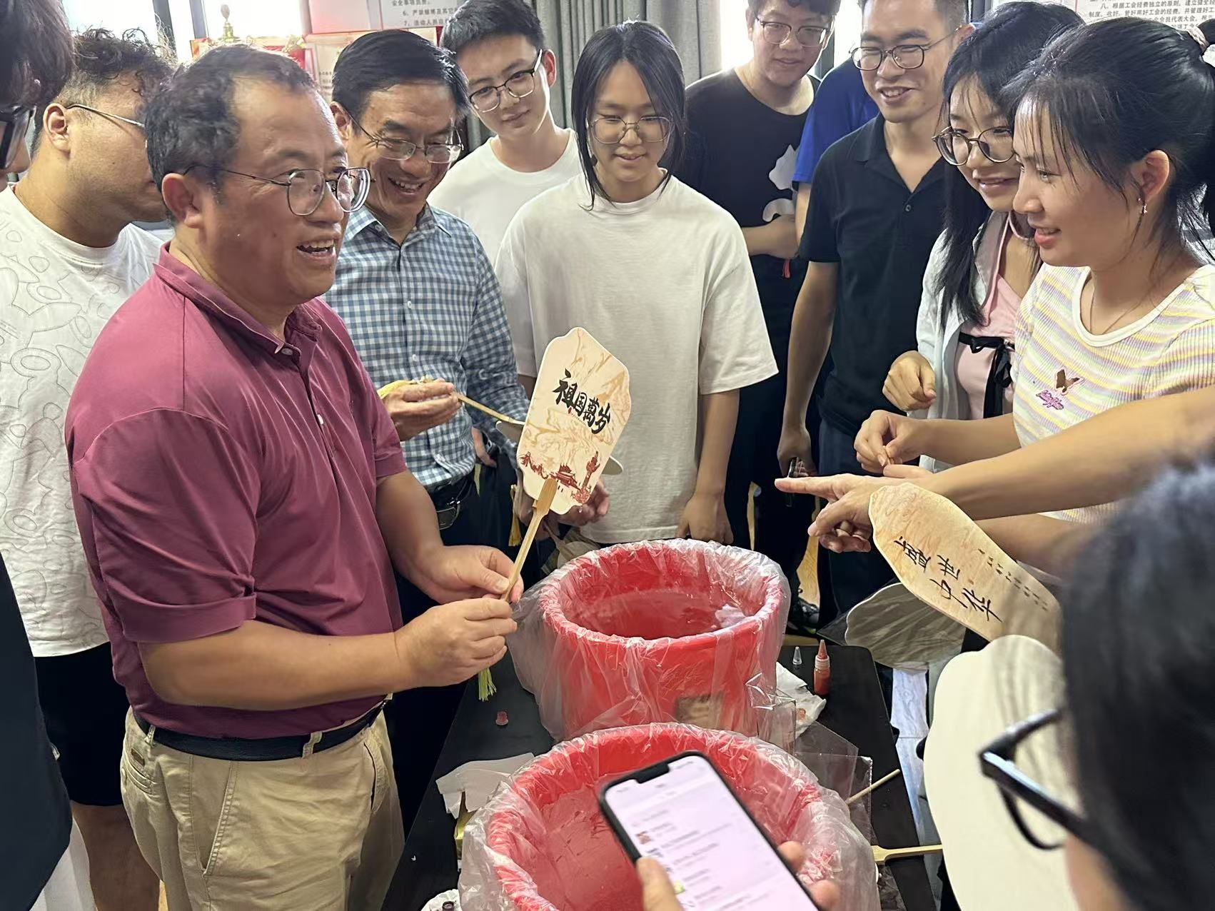 “将大漆颜料滴入水中,轻轻搅开,扇子要垂直浸入,入水时左右摇晃或轻微旋转……”在学生讲解员的指导下,啪啪啦 师生不仅亲手体验了从选材、制胎到上漆、描绘的每一个制作环节,更在此基础上进行了大胆的创新与尝试。他们用自己的理解和创意,为传统漆扇注入了新的活力。