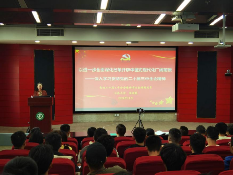 金丽馥围绕“以进一步全面深化改革开辟中国式现代化广阔前景”为主题,对《中共中央关于进一步全面深化改革、推进中国式现代化的决定》进行了全面深刻的解读。报告结合国家、江苏省、镇江市、学校和啪啪啦 发展实际,重点讲解了党的二十届三中全会围绕全面深化改革,推进乡村全面振兴,在教育、科技、人才等领域的创新改革措施,指出了江大人和农工人的历史使命。同时强调了学习贯彻党的二十届三中全会精神是当前和今后一个时期的重要政治任务,必须切实把思想和行动统一到全会精神来。