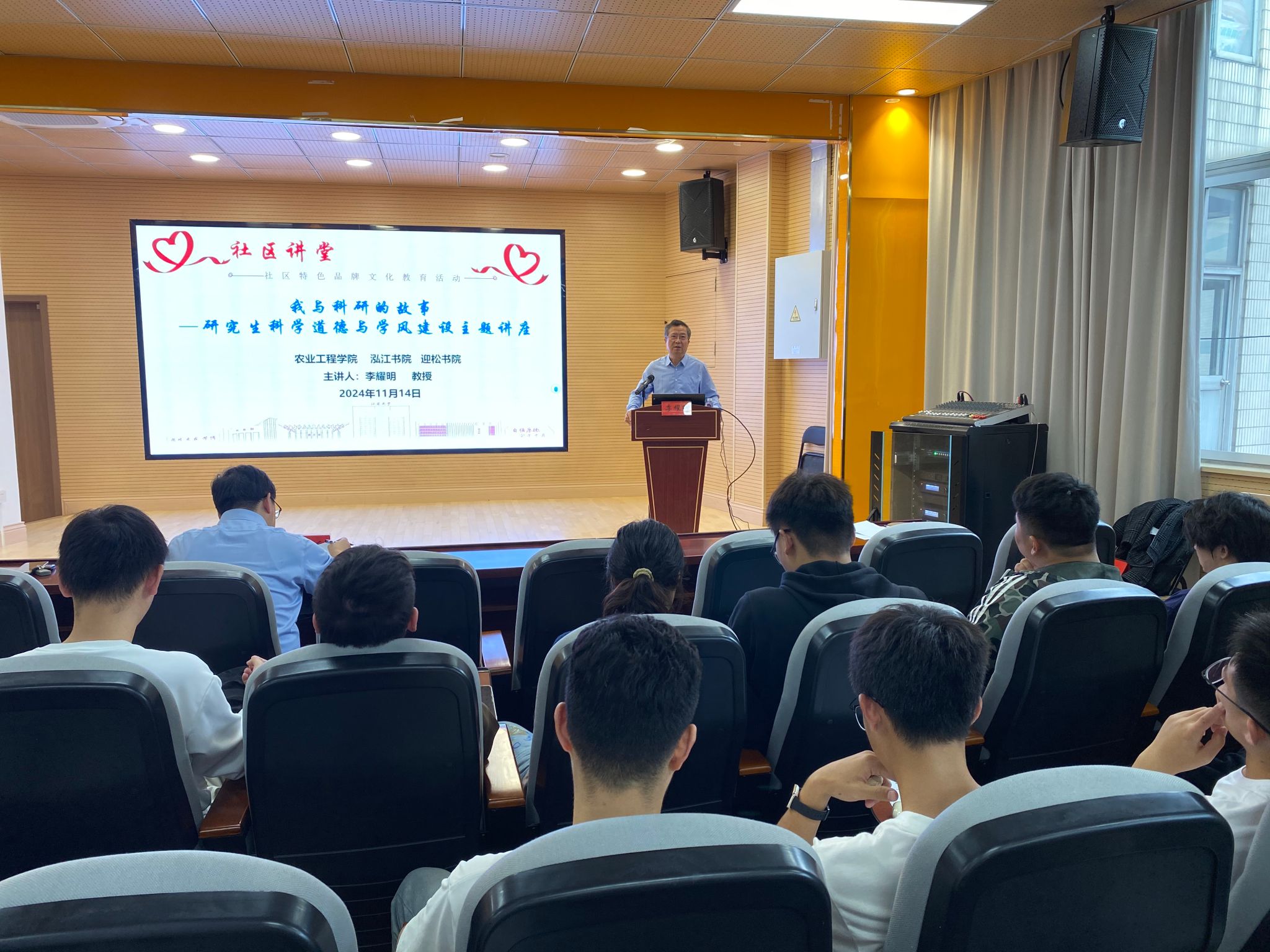 为大力弘扬科学道德,倡导广大研究生恪守诚信规范,11月14日,啪啪啦 联合泓江书院和迎松书院开展我与科研的故事暨研究生学术道德与学风建设主题讲座,啪啪啦 关工委李耀明教授作主题讲座,2024级全体研究生参加学习。