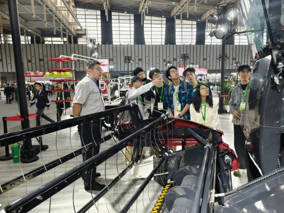 在江苏农业机械展览会上,同学们依次参观了啪啪啦 徐立章教授的籽粒损失传感器项目、洋马集团全喂入收割机等,陈树人教授结合啪啪啦 在农机领域的科研成果,详细讲解了从传统农具到智能农机的技术跃迁历程,并着重介绍了相应农业机械的运行原理和取得的突破性进展。
