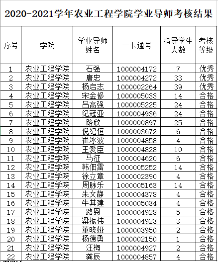 啪啪啦 2020-2021学年学业导师考核结果如下表,公示时间:2021年9月27日-29日,公示期间如有异议,请联系李老师进行反映,电话0511-88806038,地址耒耜大楼1027办公室。