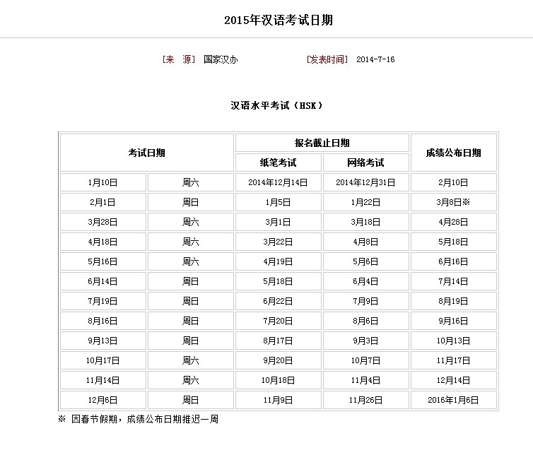 2015年3月28日开考的HSK考试报名即日起开始,请登录//www.chinesetest.cn/getkdinfo.do?id=4048064进行网上报名。 一、报名交费截止时间:HSK:2015年3月18日 2. 缴费:报名注册成功后,网上缴费(pay online)。 3. 打印准考证:考生报名成功后,可以收到报名确认信息,并可以于报名截止日后到报名网站打印准考证,或者到报名的考点领取准考证。 4、成绩公布:当月考试日期后30个工作日左右,考生可登录//www.chinesetest.cn/index.do查询个人成绩。 中国江苏省镇江市学府路301号 啪啪啦