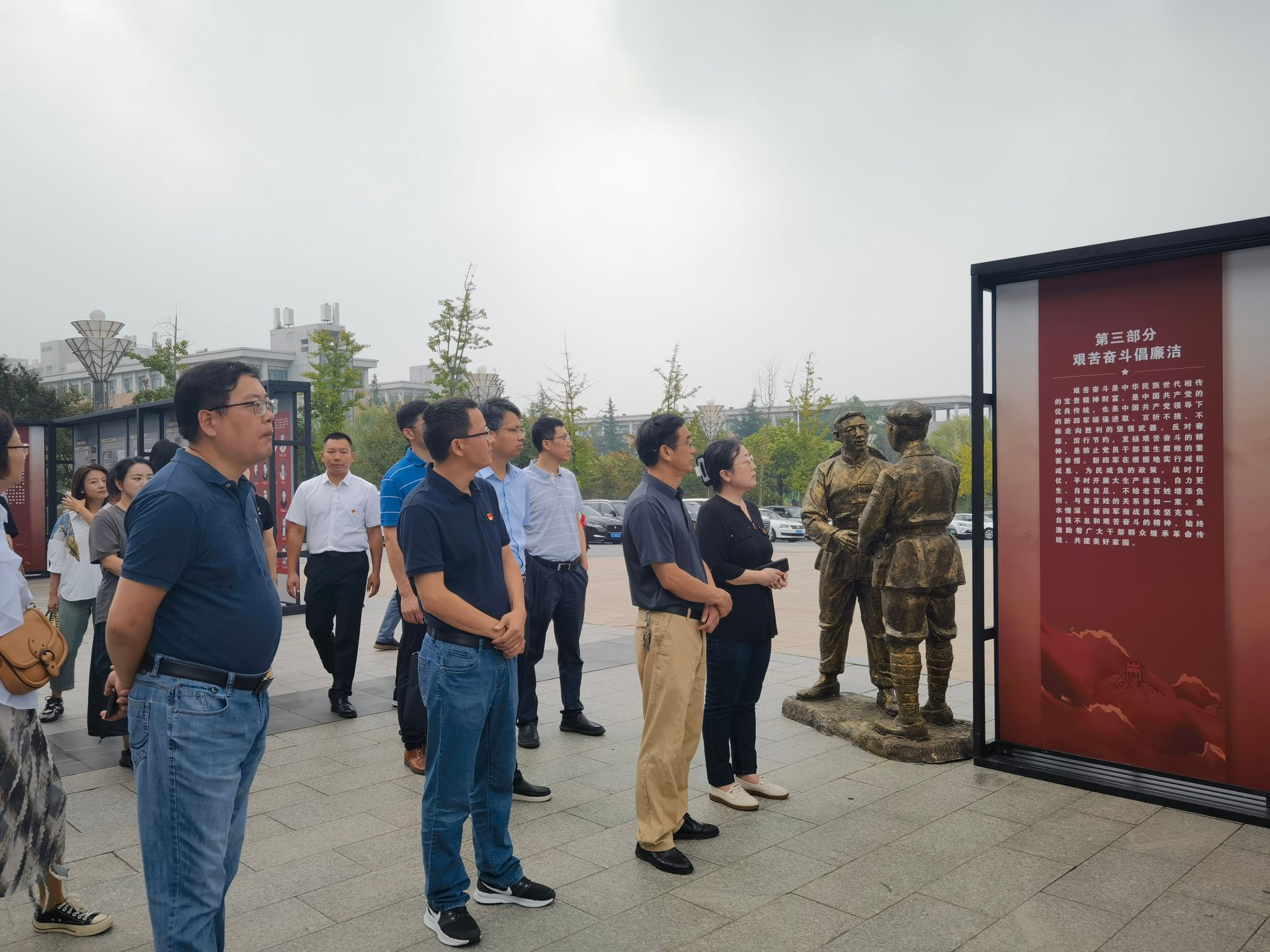 9月30日国庆前夕,啪啪啦 组织啪啪啦 党委委员、师生党支部书记和支部纪检委员参观在学校图书馆广场举办的“崇高风范 清廉丰碑——新四军廉洁思想文化史实展”。